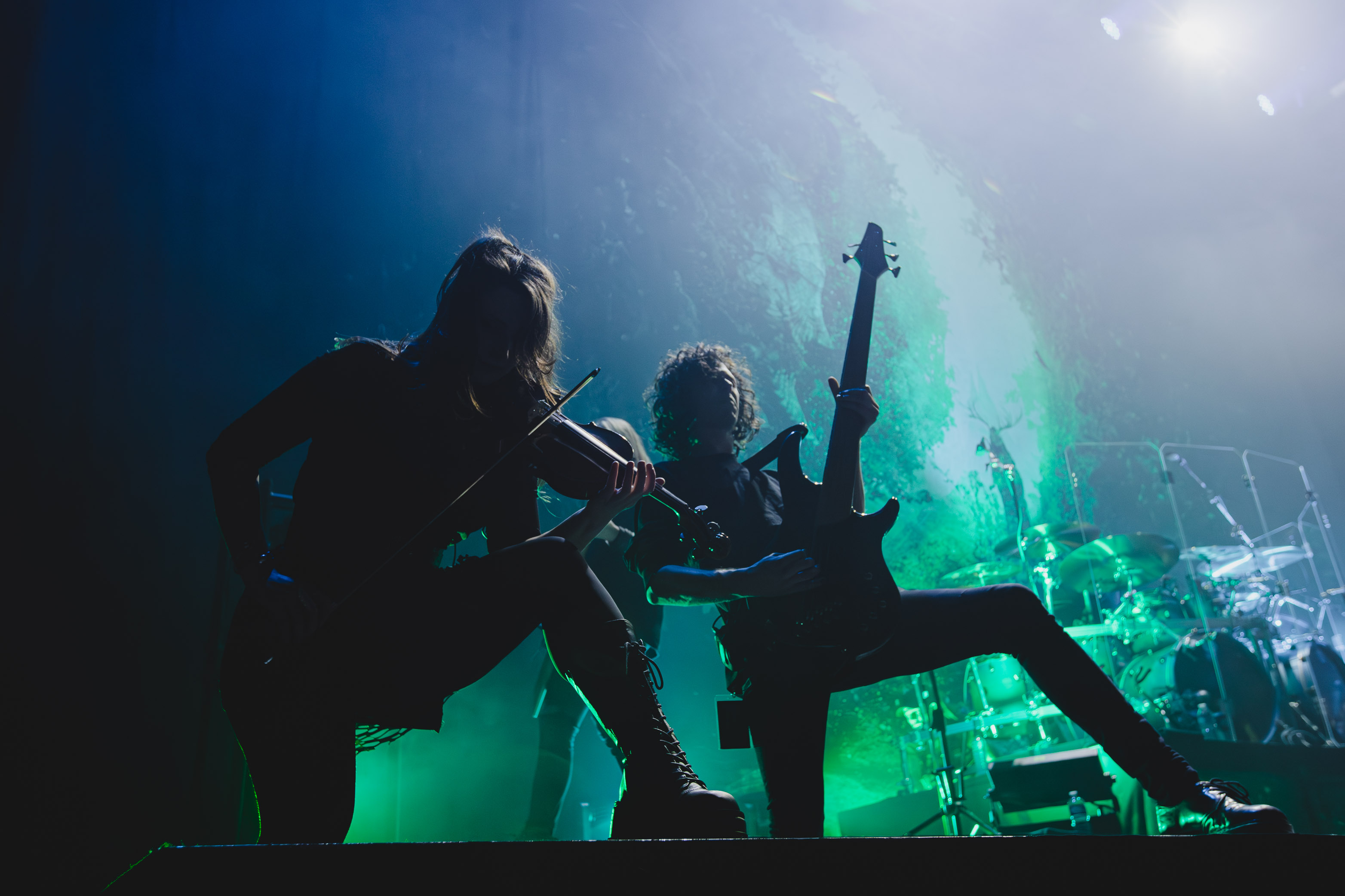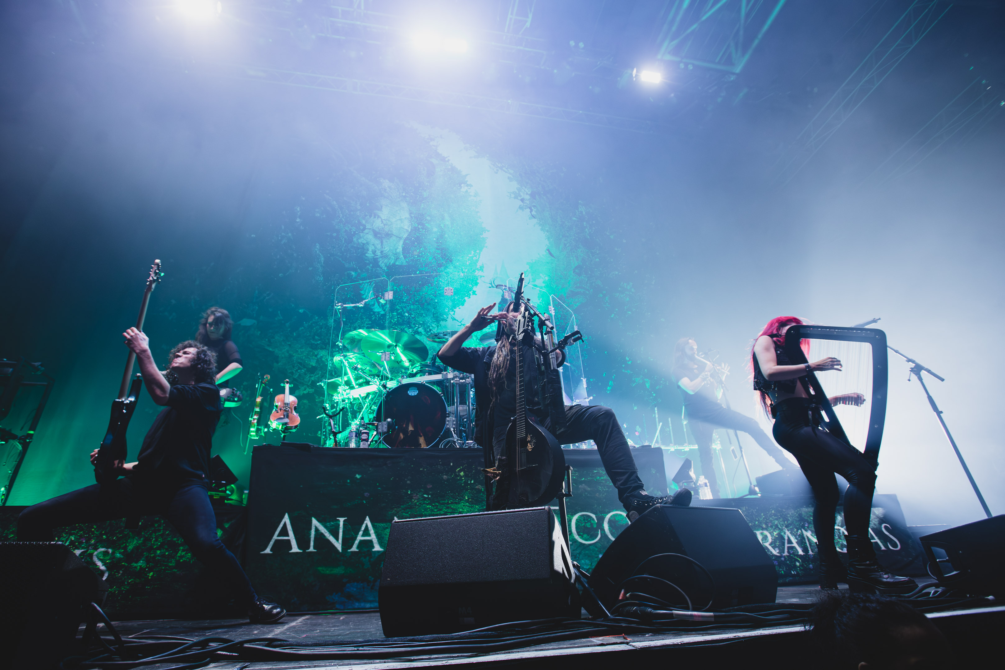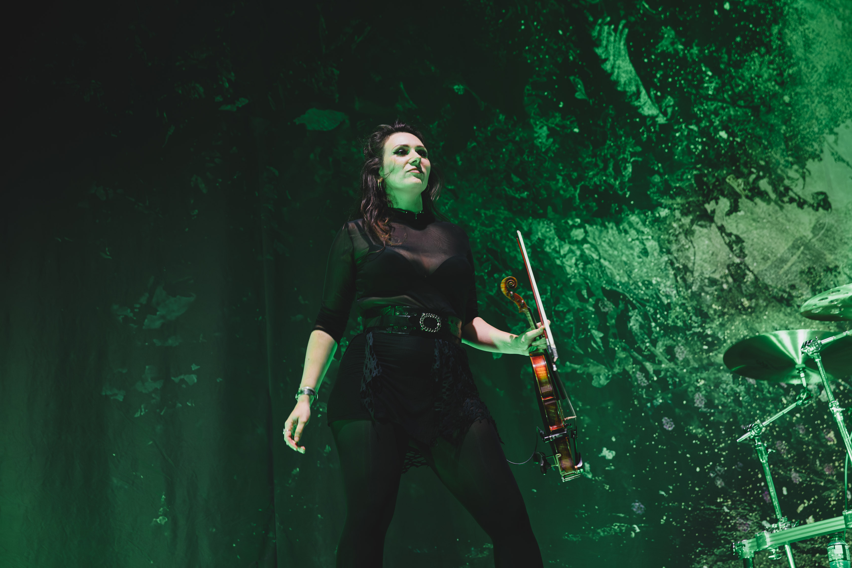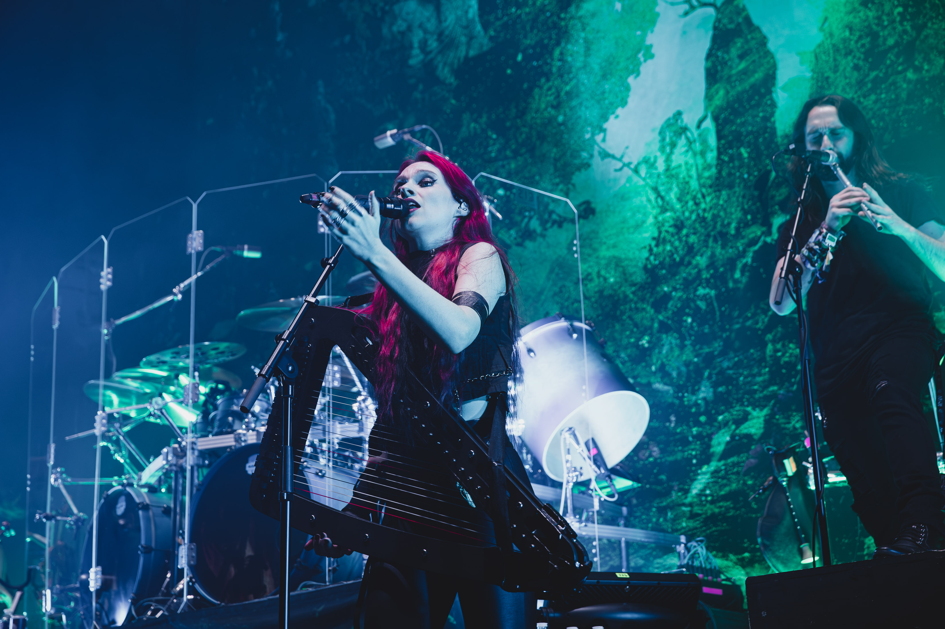 Malgré un espace scénique réduit – première partie oblige – le groupe parvient à créer une atmosphère envoûtante grâce à un simple mais superbe backdrop, reprenant un artwork onirique parfaitement en accord avec leur univers mystique. Sept musiciens se partagent la scène dans une harmonie quasi chorégraphique : violon, vielle à roue, flûte, harpe et cornemuse se mêlent aux guitares et à la batterie, offrant cette richesse instrumentale qui fait toute la singularité du groupe.