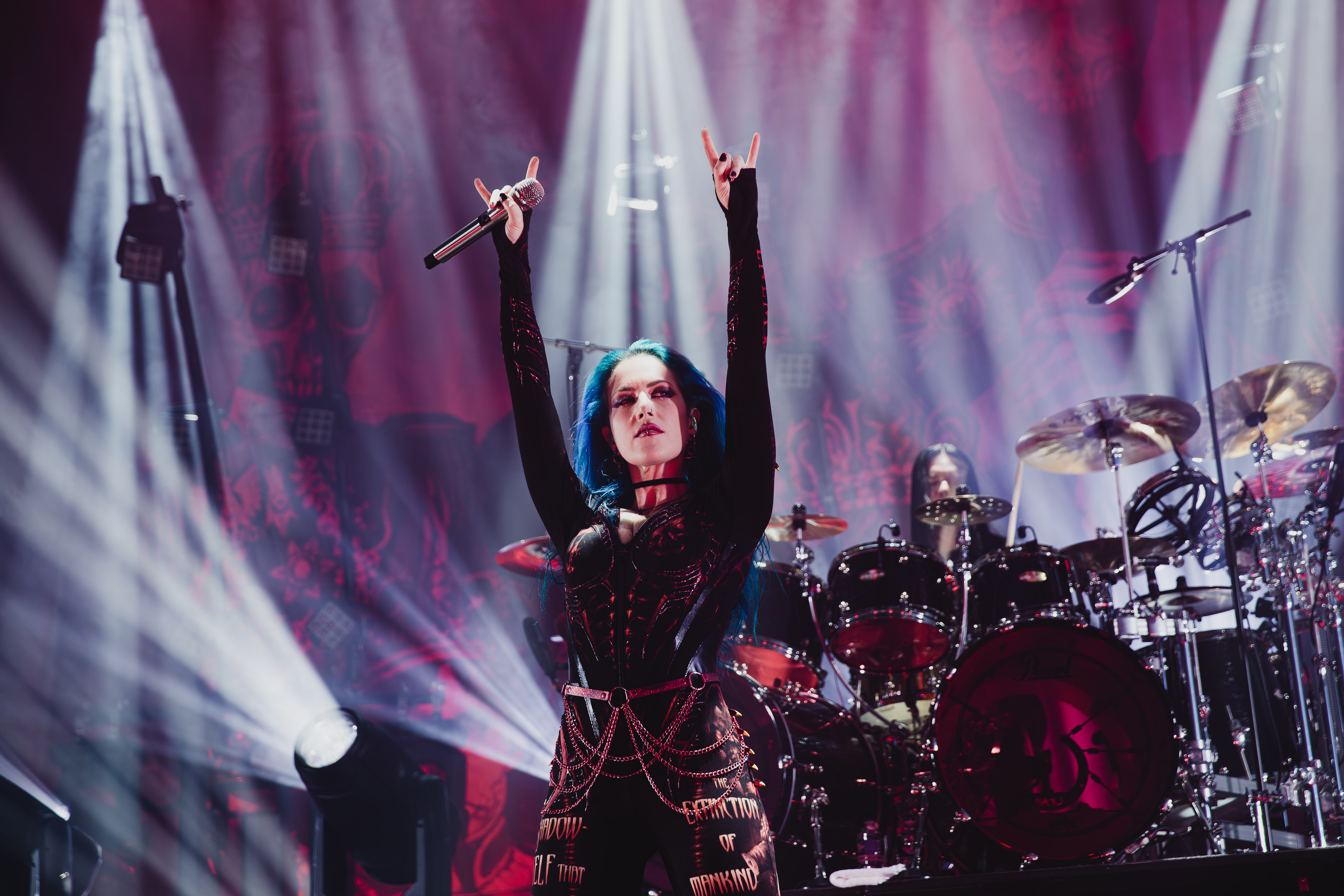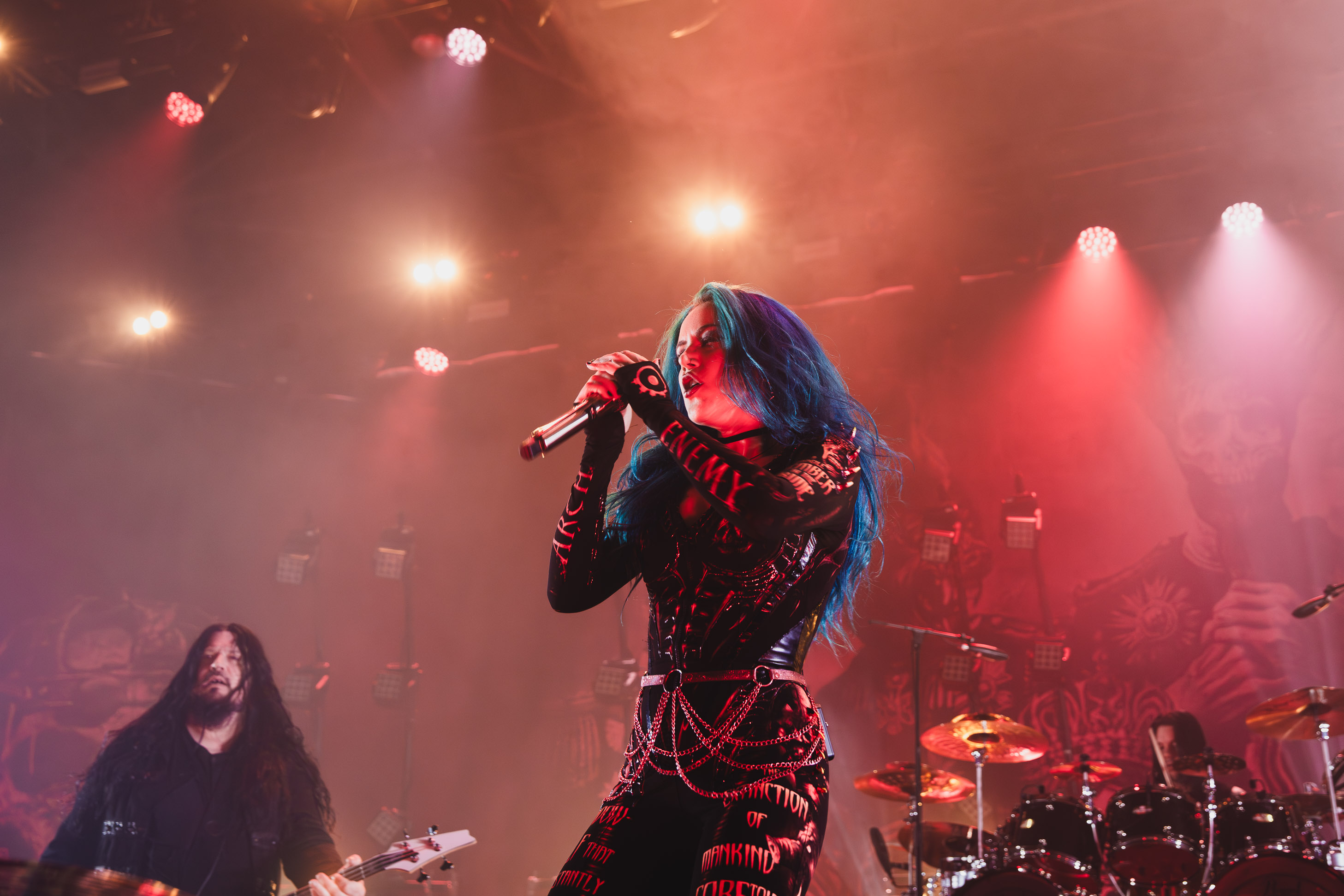 Avec leur tournée européenne Blood Dynasty Tour, le groupe emmené par Michael Amott et Alissa White-Gluz revient plus fort que jamais. Sur scène, un sublime et immense backdrop à l’effigie du nouvel album Blood Dynasty plante d’emblée le décor : la soirée s’annonce impériale.
