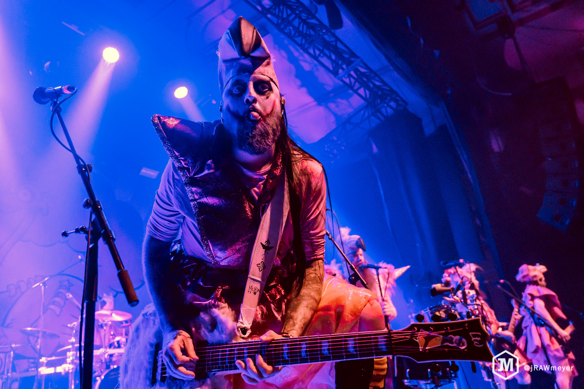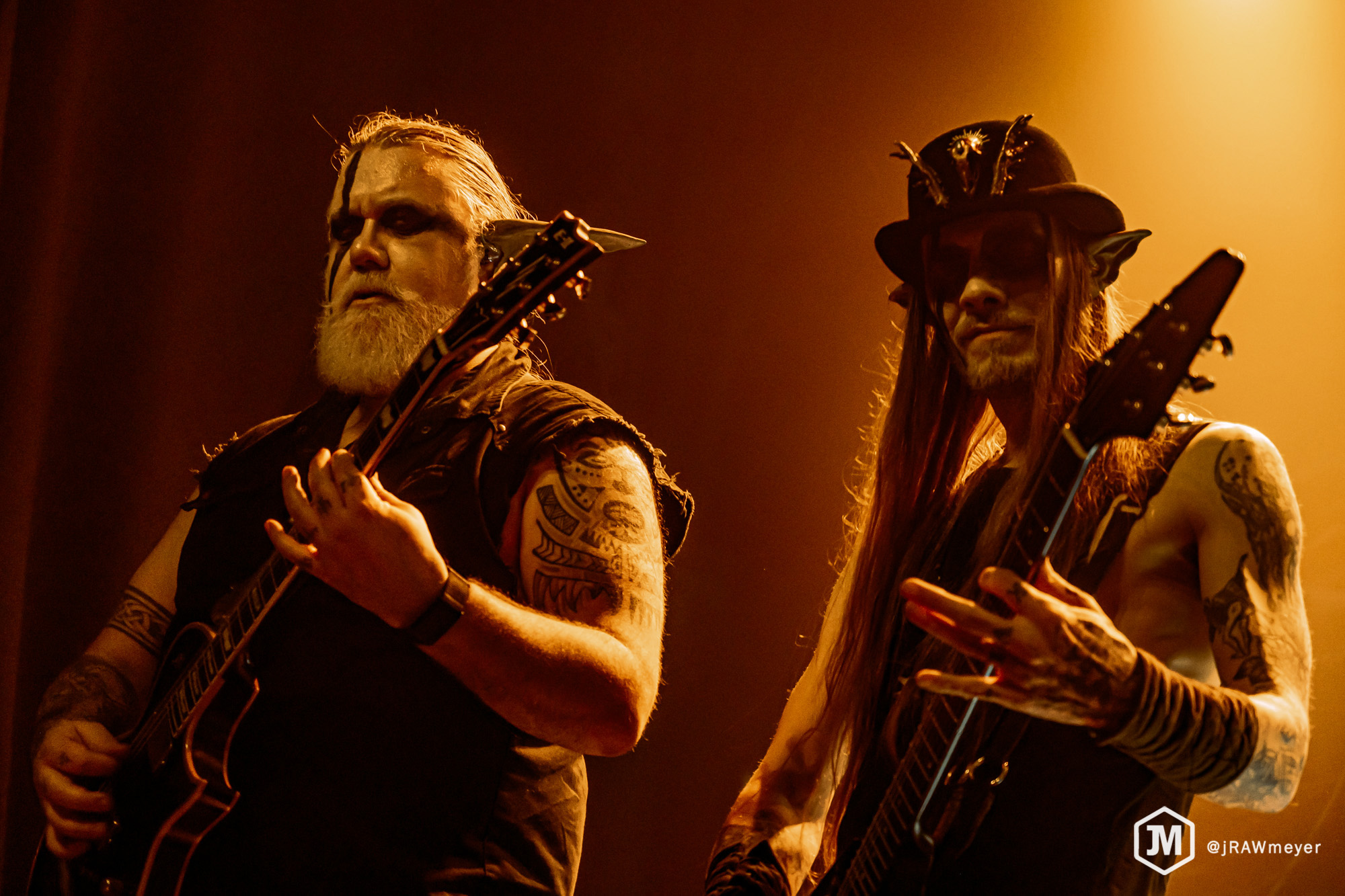 Une intro à la Tim Burton m’attire près de la scène, dont le décor reflète une ambiance plus sombre, presque inquiétante. Des musiciens portant oreilles pointues et maquillage prennent place, tandis qu’un chanteur torse nu, à la longue chevelure, s’installe devant son micro orné d’une tête de bélier sculpté. Il s’agit de Mathias Dahlsveen, alias Kistelach, qui remplace pour la tournée Mathias « Vreth » Lillmåns, tombé malade.