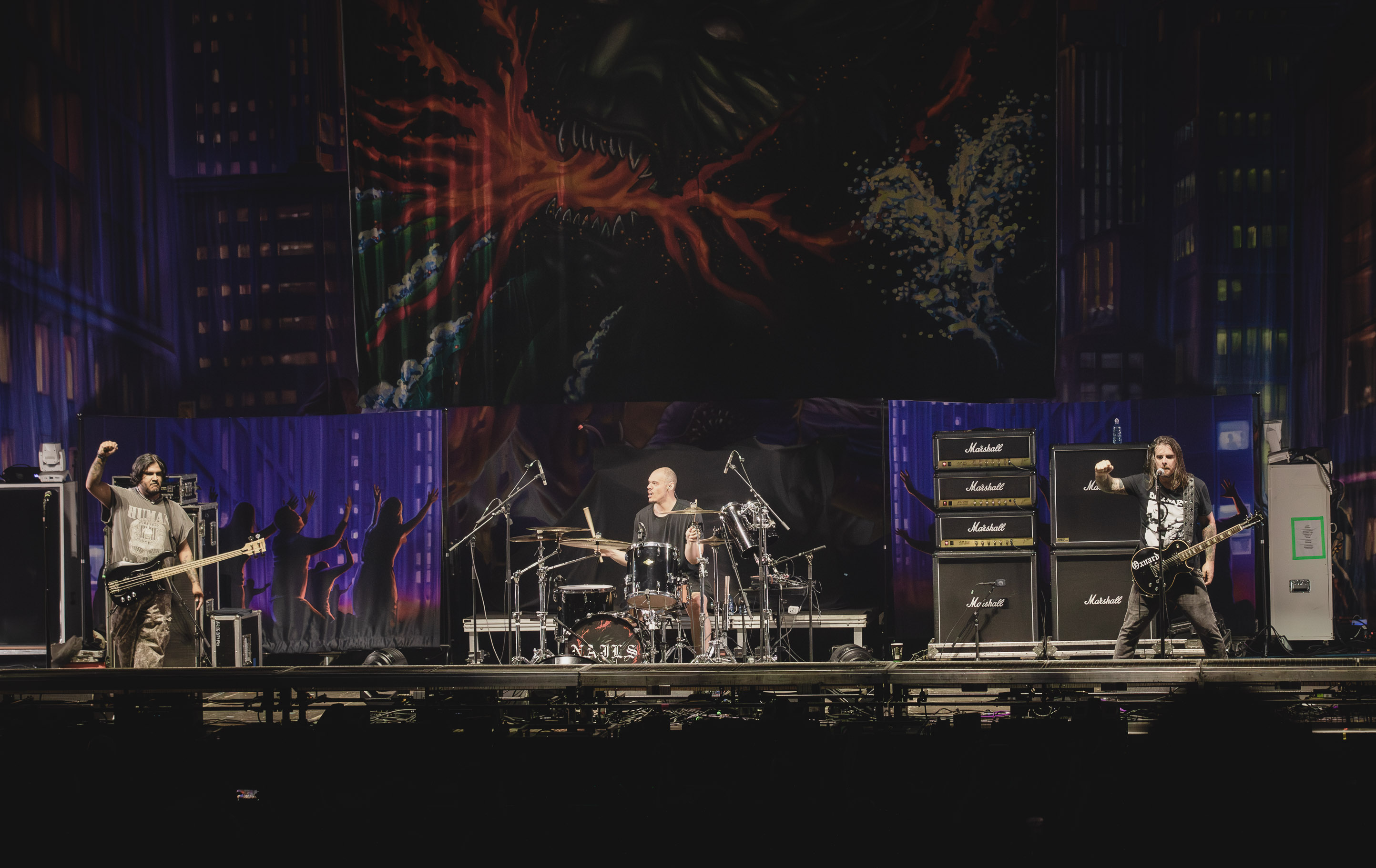Heureusement les affaires reprennent un peu plus tard avec les Allemands de Kreator. Le show va d'ailleurs être le plus spectaculaire de la soirée avec moult effets pyrotechniques, fumigènes, pluie de confettis et autre rubans colorés. Ca commence d'ailleurs avec le « Run To The Hills » de Maiden diffusé dans la sono et la foule qui reprend le refrain à tue-tête puis la projection d'images de rébellion sanglantes sur un grand rideau tendu devant la scène et sur fond de « Eve Of Destruction » de P.F. Sloan. Et c'est parti pour 90 minutes de thrash de haut niveau. On retrouve le leader Miland « Mille » Petrozza au chant et à la guitare et l'autre membre fondateur, le batteur Jürgen « Ventor » Reil. Le lead guitariste c'est le Finlandais Sami Yli-Sirniö (Waltari) et à la basse je reconnais le Français Frédéric Leclercq (DragonForce, Sinsaenum, Loudblast...).