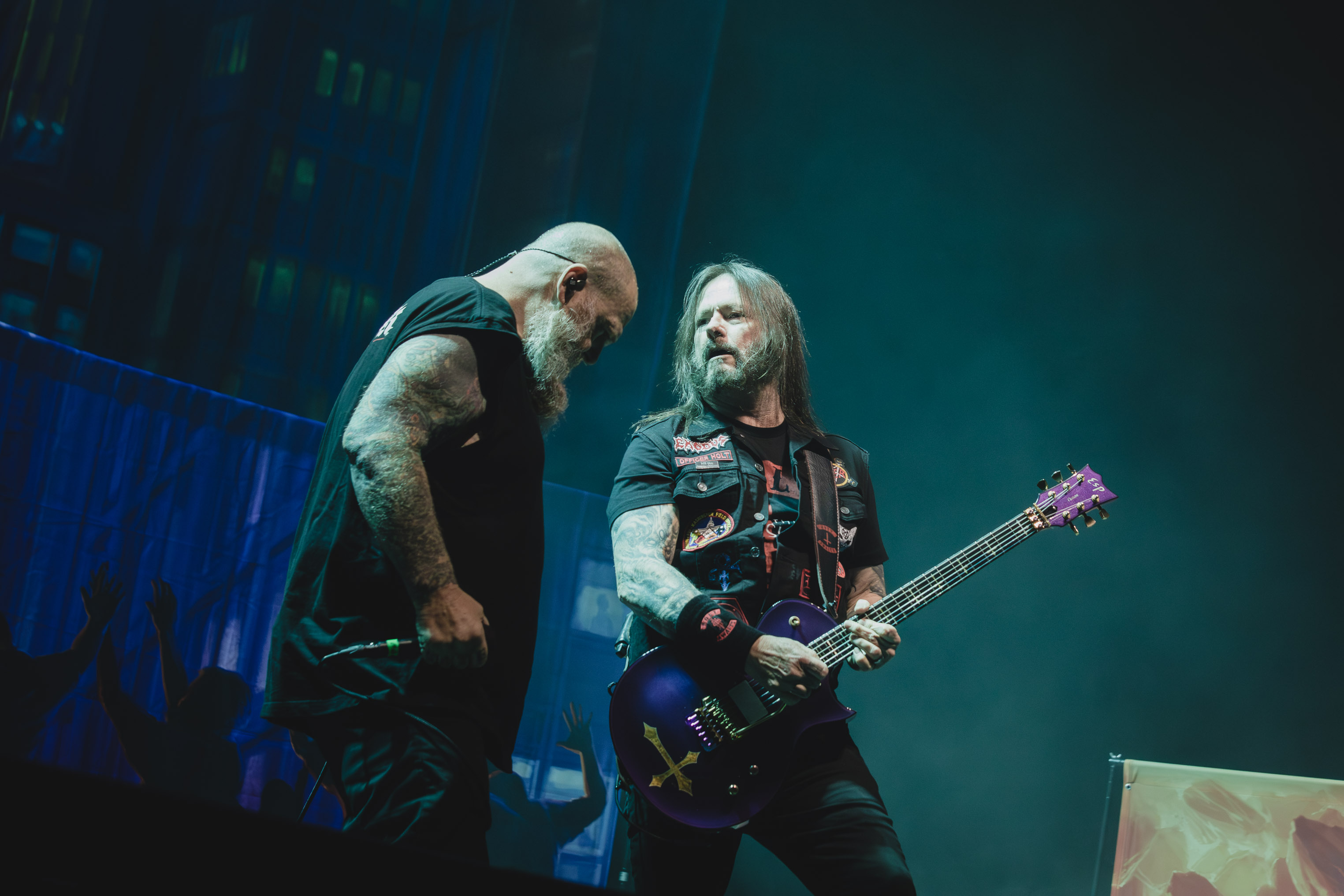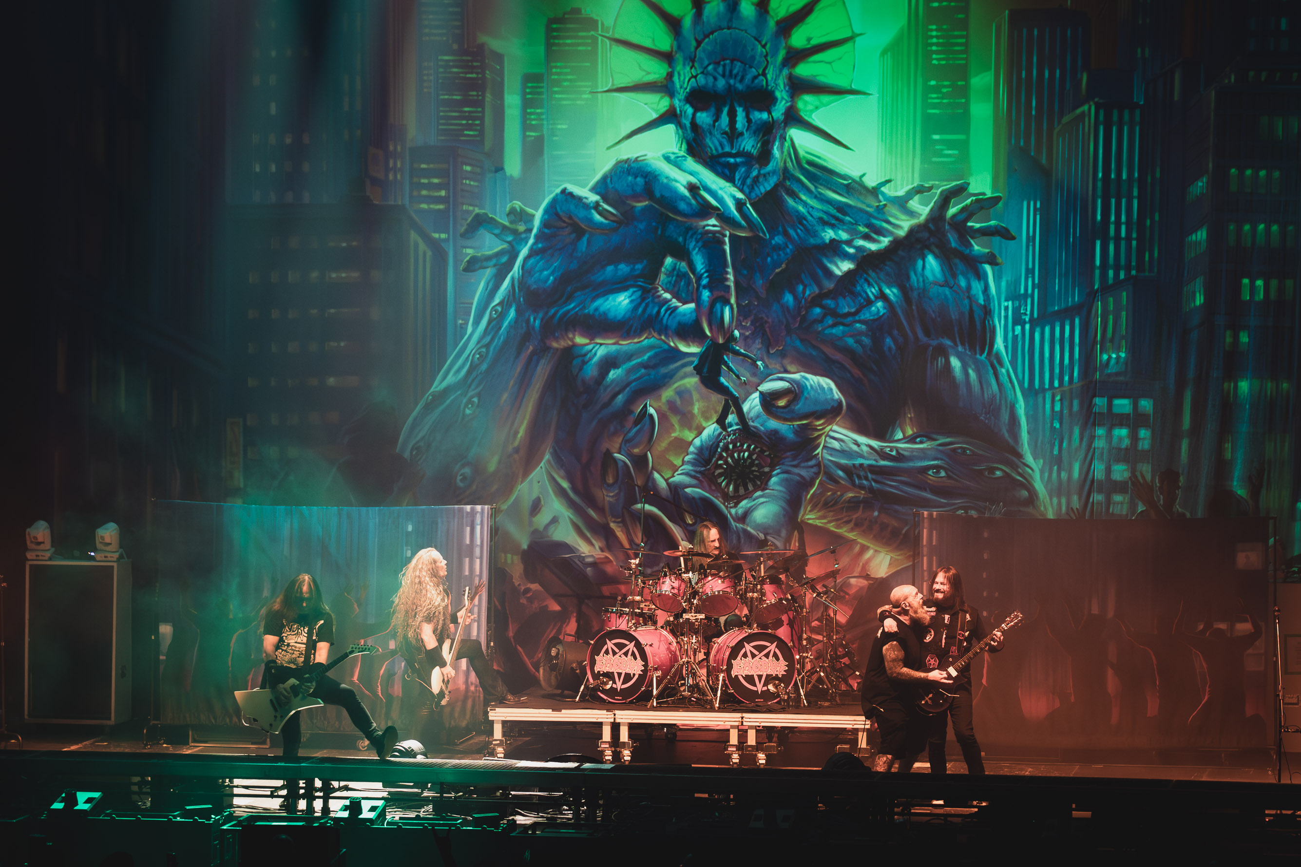 Exodus prend la relève sur fond du « We Will Rock You » de qui on sait. Ca attaque très fort avec « 3111 » du nouvel album « Goliath » sorti il y a quelques jours seulement. Le quintet n'a plus que 2 membres d'origine à savoir le batteur Tom Hunting présent depuis 1979 et le légendaire guitariste Gary Holt même si celui-ci n'est arrivé qu'en 1981 mais c'est le seul à apparaître sur tous les albums d'Exodus. Et n'oublions pas que Gary est aussi celui que j'ai maintes fois vu avec Slayer après le décès de Jeff Hanneman en 2013. A la basse c'est Jack Gibson, présent depuis une trentaine d'années. Quant à Lee Altus aux guitares et Rob Dukes au chant ils ont rejoint Exodus il y a 20 ans. Voilà donc un autre groupe dont la carrière est loin d'être un long fleuve tranquille mais il semble avoir trouvé un certain équilibre depuis l'avènement du nouveau siècle...