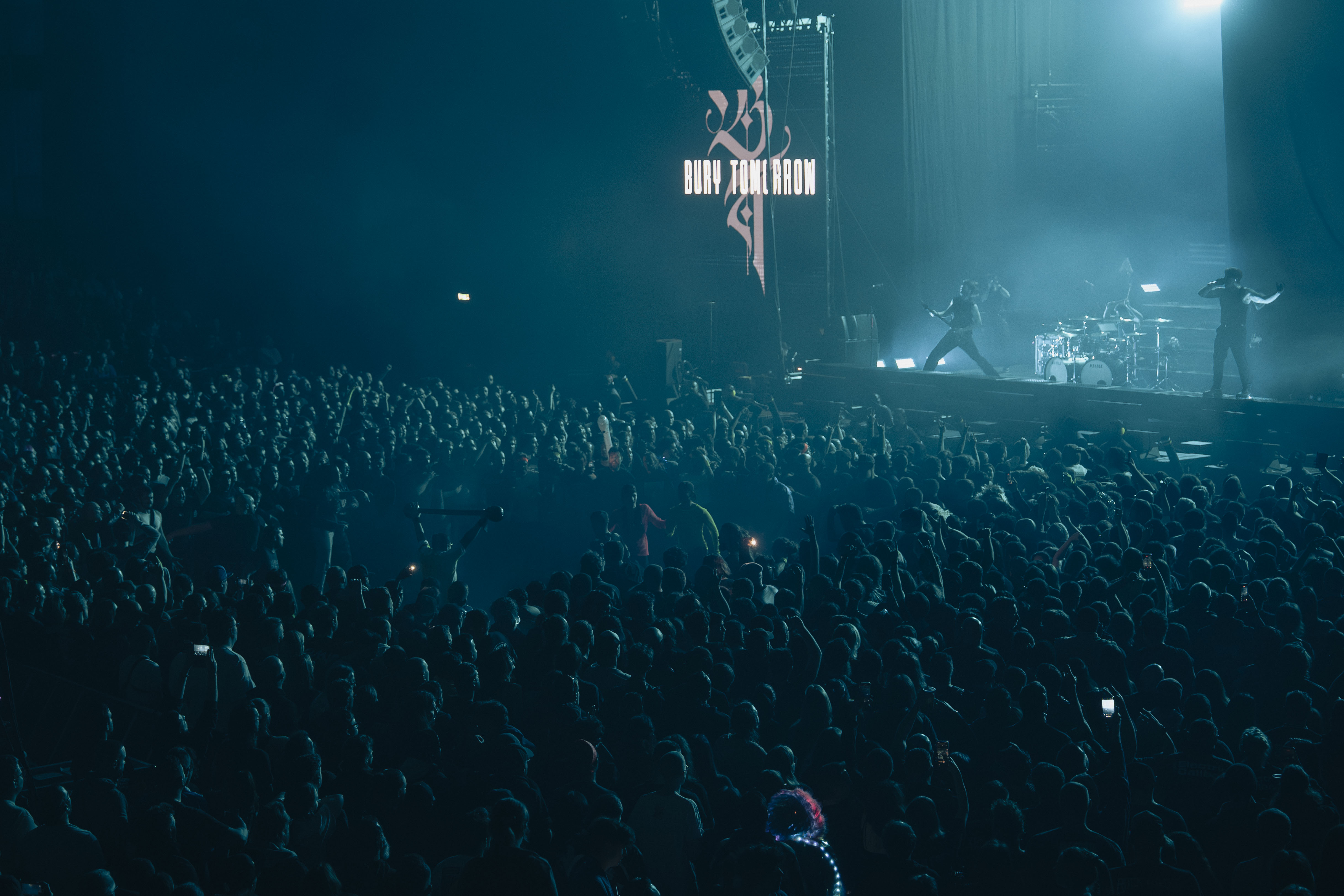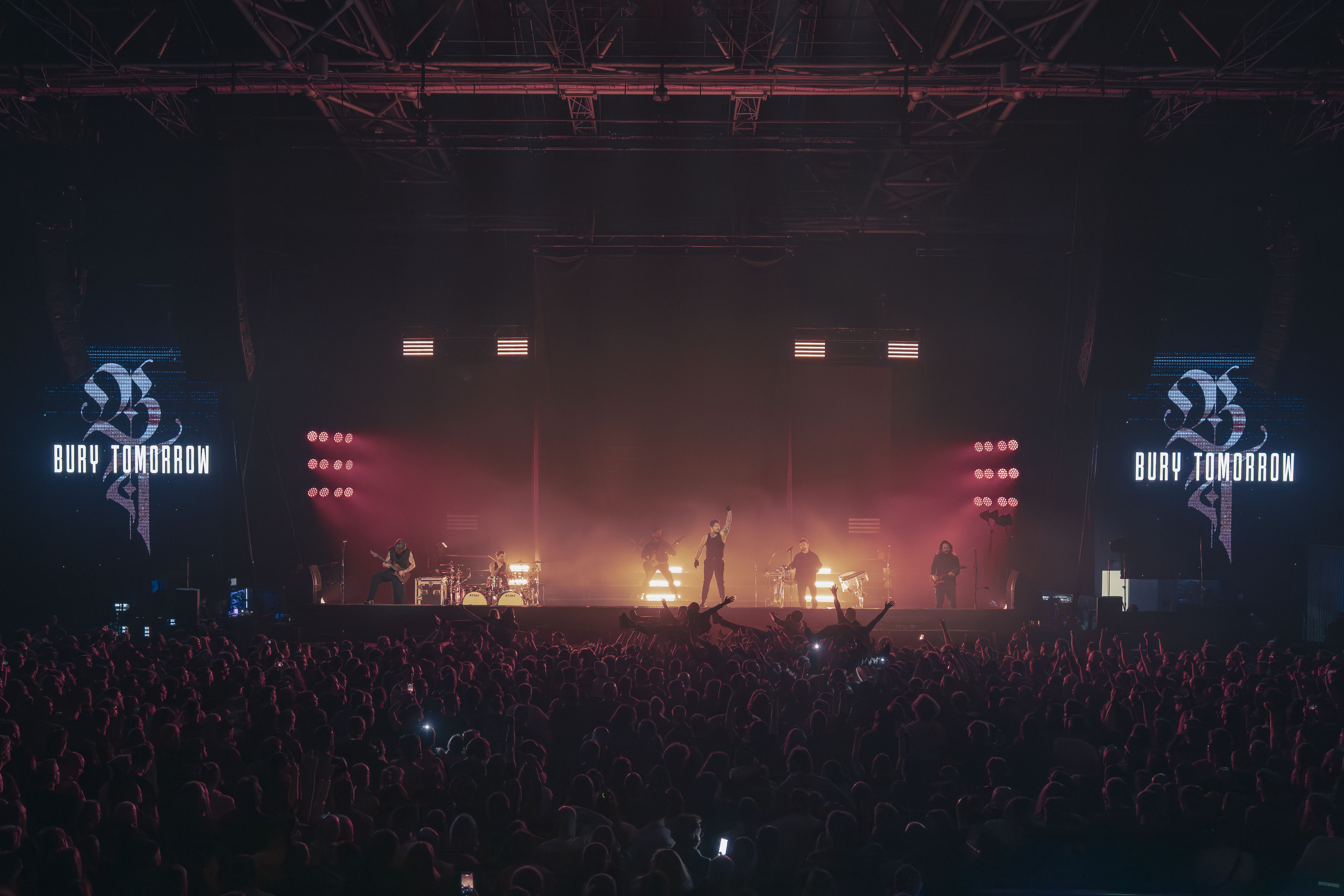 À 20h00 pile, un message d’alerte s’affiche : « la purge commence ». Tous les moshpits et wall of death sont officiellement autorisés. Dans la fosse, la tension monte instantanément. Les six membres de Bury Tomorrow débarquent fièrement sur scène et attaquent sans détour avec Choke. Le ton est donné. C’est massif et précis.