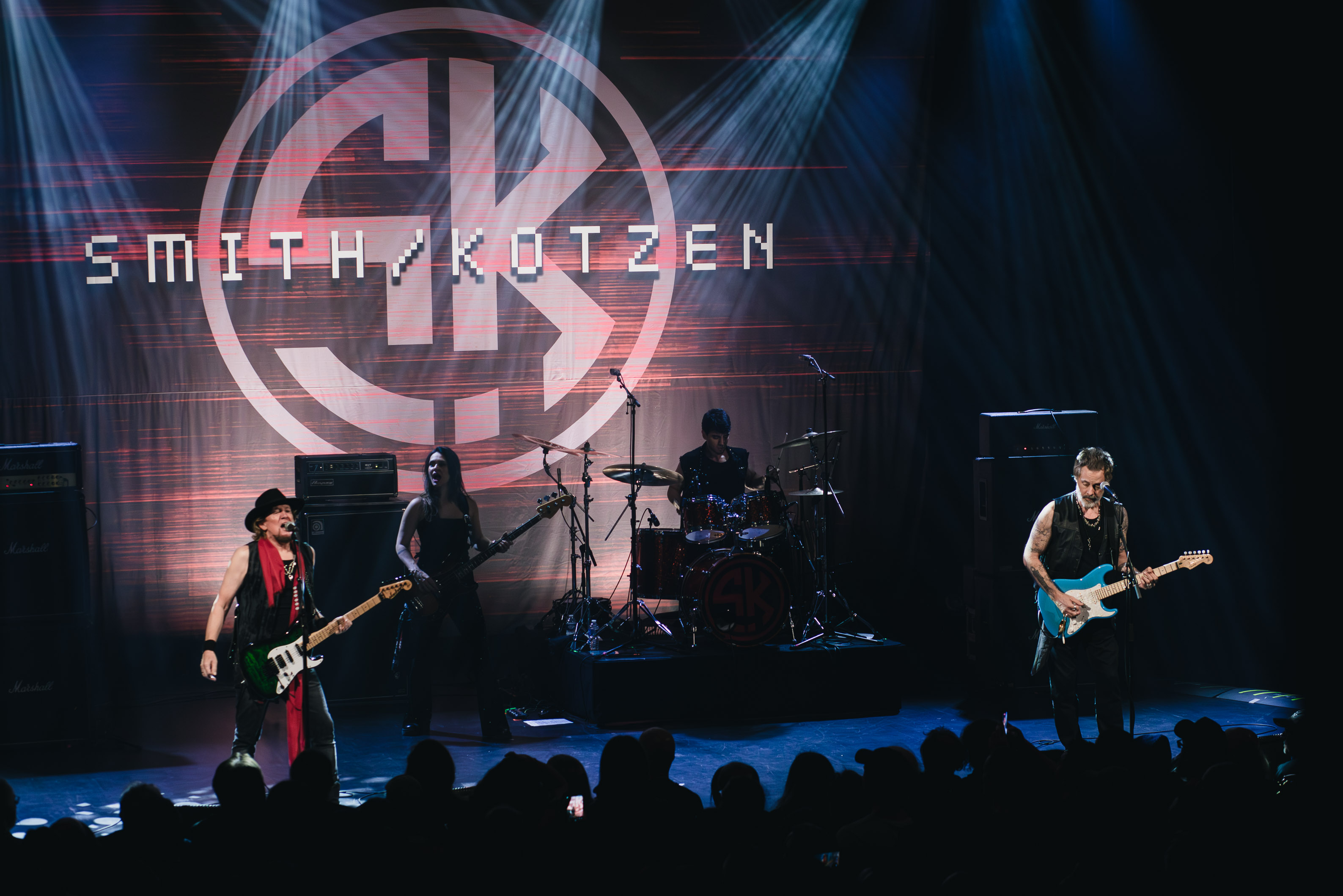 Smith et Kotzen montent sur scène à 21h00 précises sur fond musical de Bad Company et c'est parti pour 90 minutes de feu d'artifice guitaristique. Ils sont entourés d'une charmante et talentueuse bassiste, Julia Lage, et d'un jeune batteur, Bruno Laverde, qui se révèlera tout à fait percutant. Tous deux nous viennent du Brésil et forment une section rythmique redoutable. Adrian et Richie se partagent le chant et les soli de six-cordes. La setlist va piocher dans les deux albums et le EP du duo et on aura droit à 2 surprises au rappel. Je dois avouer que j'ai une préférence pour les titres de l'album éponyme comme le bien classic rock « Glory Road » qui rappelle furieusement la carrière solo de Glenn Hughes, le heavy « Taking My Chances » qui sonne Black Country Communion, le solide « Running » avec son riff accrocheur et son refrain imparable et bien sûr mon chouchou « Scars » pour une version hard/bluesy orgasmique que ne renierait pas Robin Trower... Le second opus sera bien évidemment bien représenté également avec les très bons « Black Light » et « White Noise » et « Hate And Love », le superbe « Blindsided » mené tambour battant par Bruno et le bien FM « Outlaw » qui sonne très années 80.