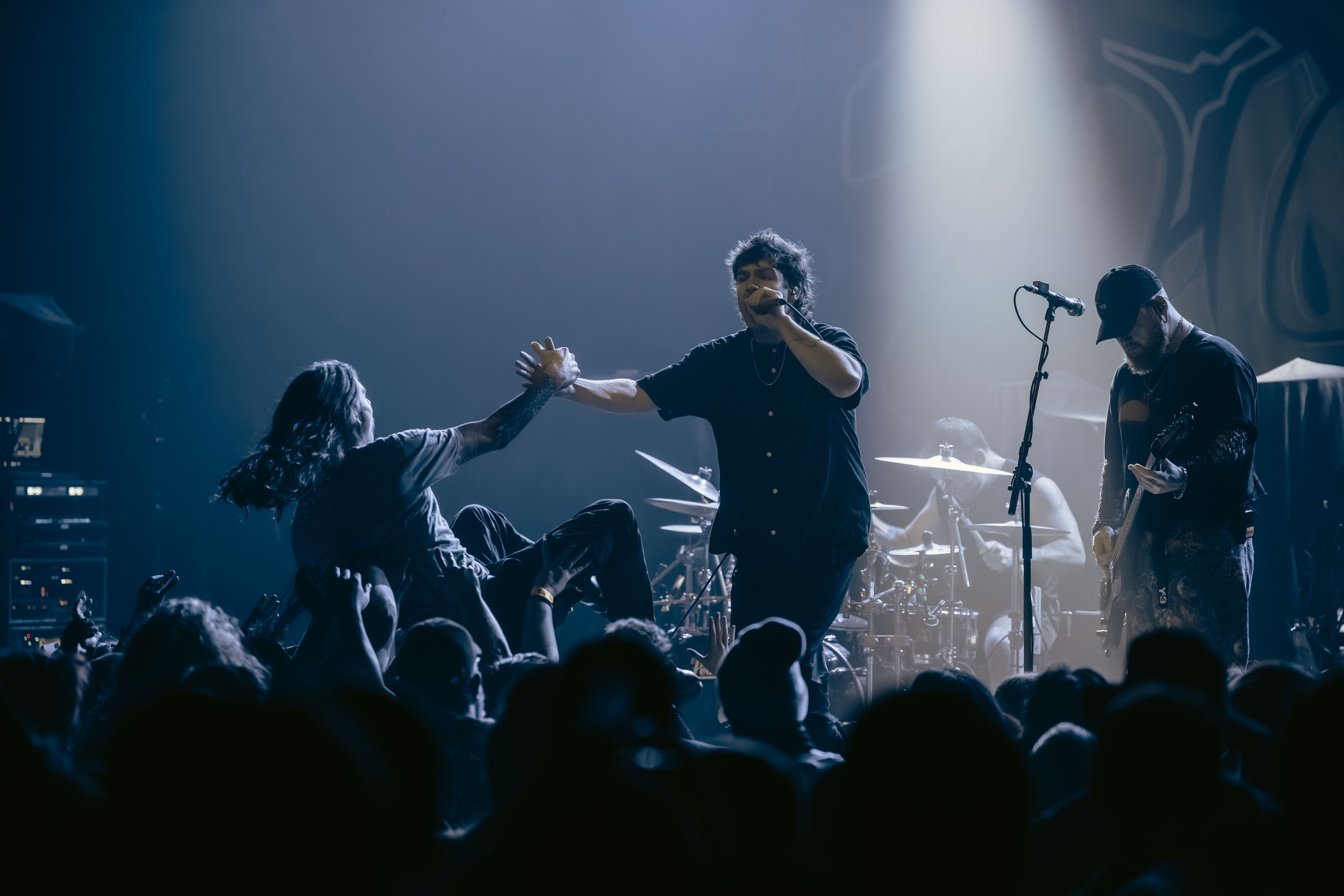On arrive juste à temps pour Graphic Nature, arrivés sur scène à 19h20 pétantes. La formation Anglaise assène l’Elysée Montmartre de son nu metalcore brutal aux accents électro. Fun fact, le nom du groupe tire son origine de la piste 6 de l’album « Koi No Yokan » de Deftones. Graphic Nature fait partie de ces nouveaux noms de la scène metal UK. Sa place aurait été toute trouvée aux côtés de Malevolence le 28 octobre dernier mais c’est avec Thrown (groupe qui a justement joué avec Malevolence et While She Sleeps à l’Elysée Montmartre) que Graphic Nature s’est produit plus tôt dans l’année, en avril à la Maroquinerie. Le quintet vient défendre les titres de son premier album Who Are You When No One Is Watching ? (2024) et son EP A Mind Waiting to Die (2023). Le public répond bien favorablement à la belle énergie du groupe en formant les premiers circle pits de la soirée et autres two steps. Mention spéciale à Harvey Freeman (chants) qui souligne l’importance de soutenir les groupes émergents par l’achat de merchandising face à une économie du streaming inégale et non favorable aux musiques extrêmes et alternatives. Il mentionnera aussi que le pit est un espace inclusif et y invite les girlies pop à y prendre place ! En somme, Graphic Nature délivre un set maîtrisé et une belle performance en moins de 30 minutes, donnant un bel aperçu qui ne présage que du bon pour la suite !