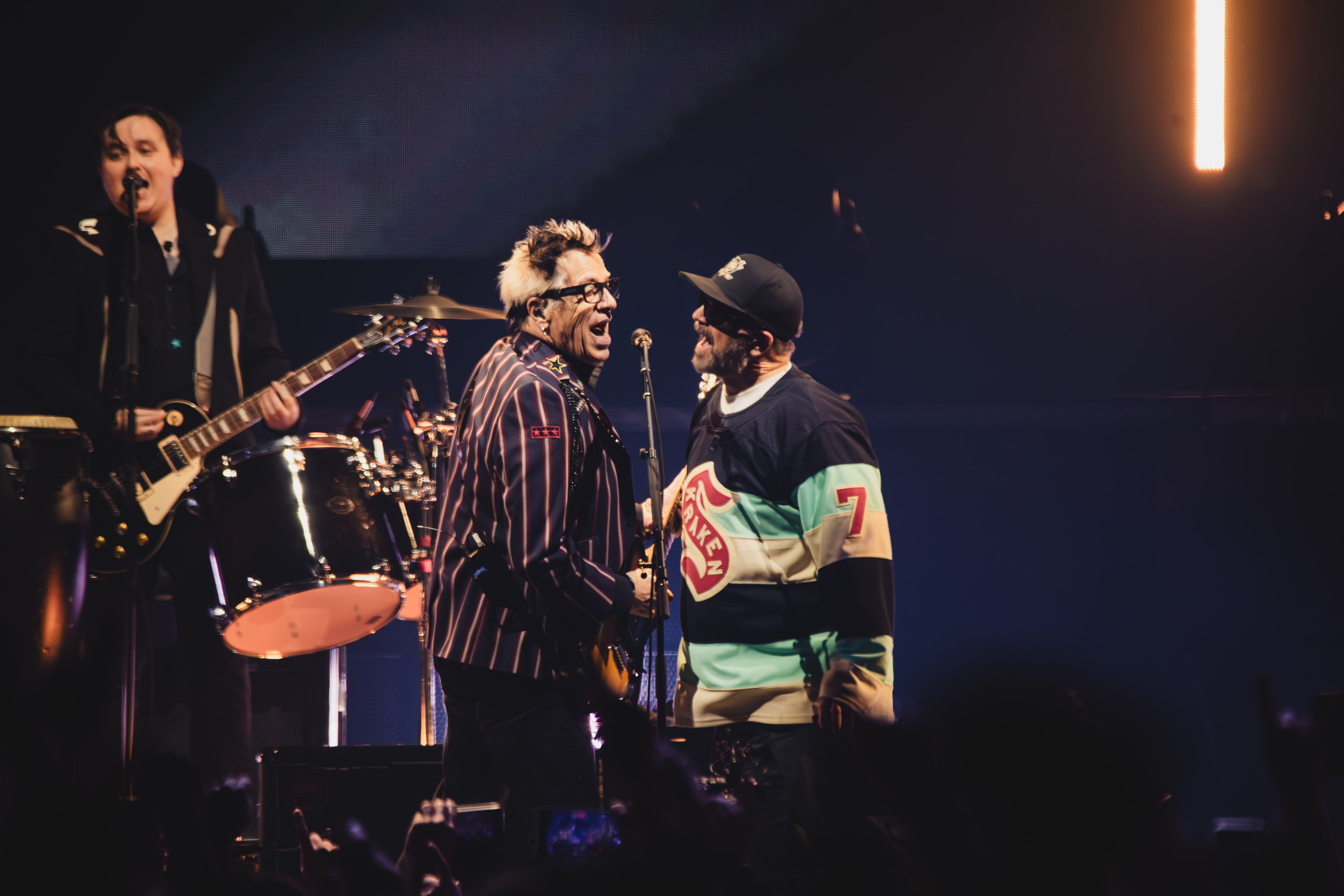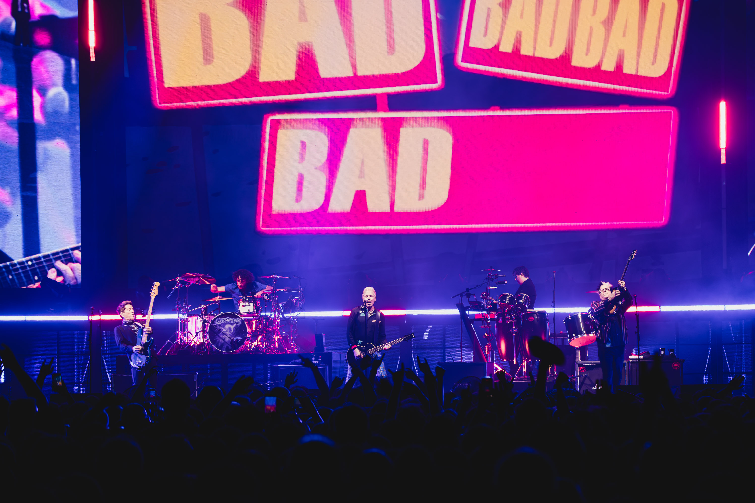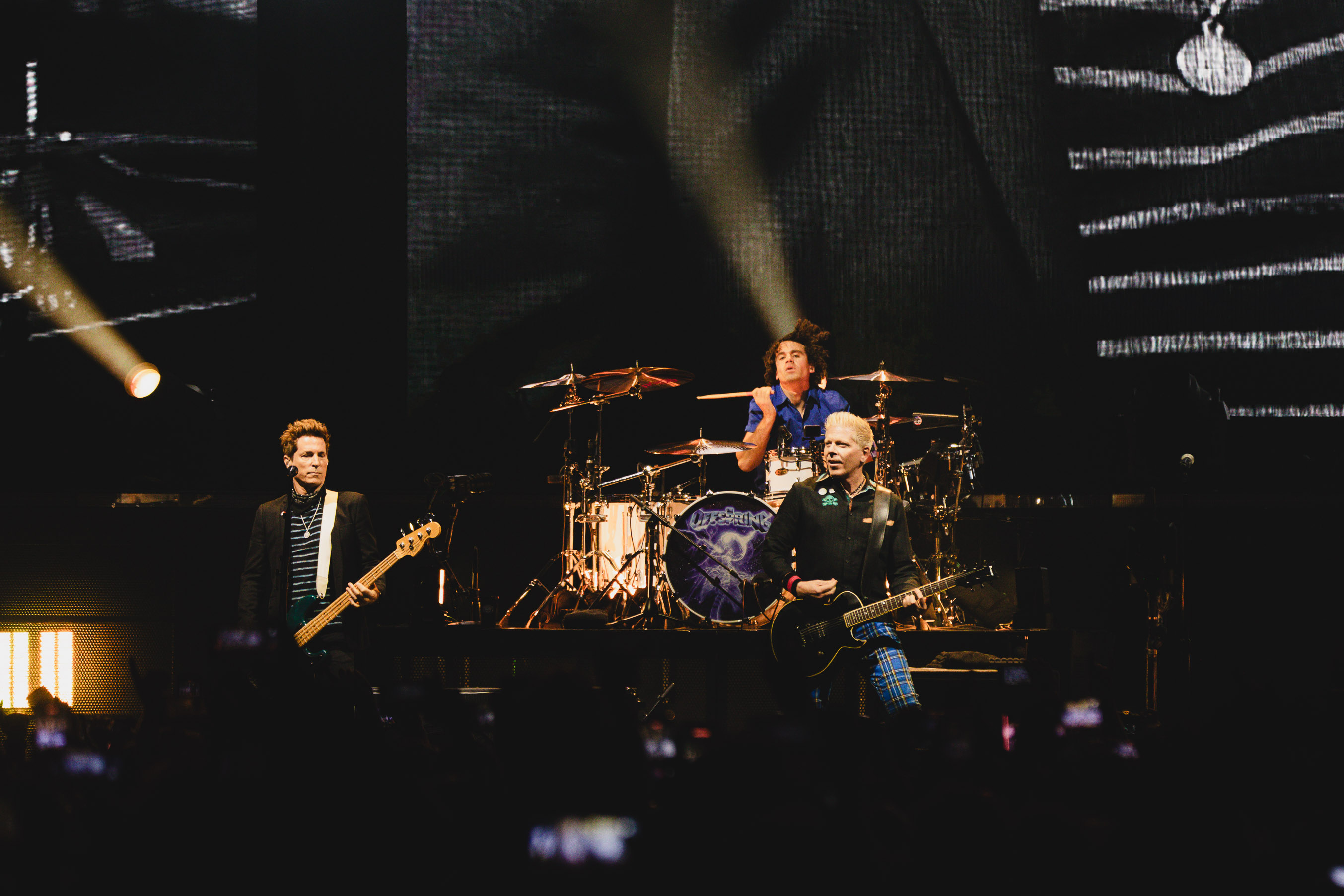Le compte à rebours est ensuite annoncé. 24 minutes à tenir avant de voir The Offspring. Une attente avec quelques provocations complices, comme le booty cam ou le look alike cam qui nous laisse quelques images et rires mémorables. 21h20, comme annoncé. Compte à rebours, la salle s’assombrit, une lumière bleue se diffuse, et les premières notes de Come and Play retentissent. The Offspring entre en scène, sous les cris.