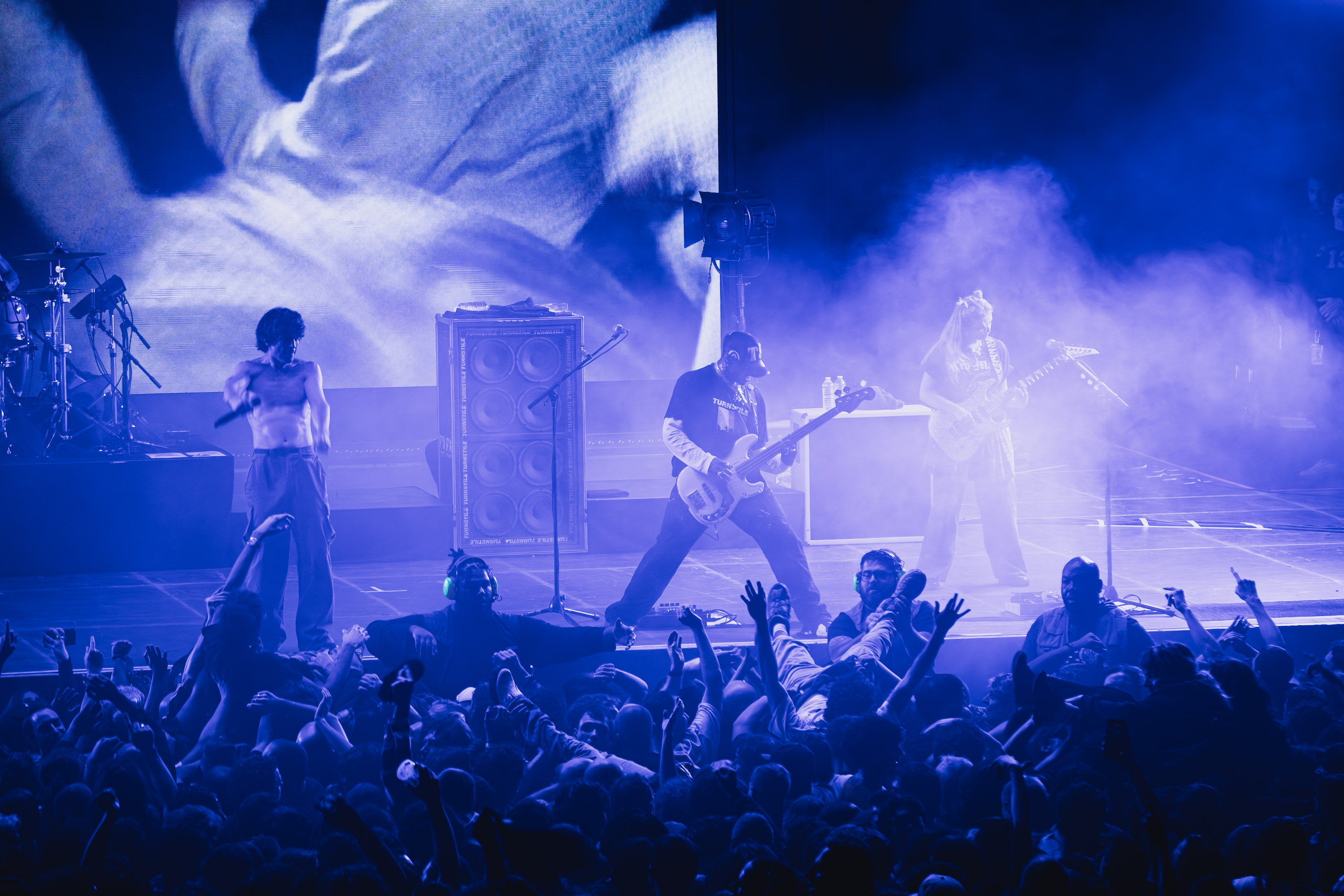 Il en va s’en dire que cela reste du hardcore et, de ce fait, les titres sont courts en s’enchaînent à folle allure. De l’ouverture tout en douceur sur « NEVER ENOUGH » vite suivi par T.LC (TURNSTILE LOVE CONNEXION).. L’atmosphère se voit déjà plongée dans une chaleur et une frénésie palpable. Ce qui rend l’expérience d’autant plus immersive, c’est cette caméra embarquée à même la fosse. Pour celles et ceux comme nous places en gradins, on a tout de même la sensation de faire partie de ce joyeux bordel et d’admirer tous ces kids toute génération confondue, s’adonner à tout ce qui fait d’un pit hardcore une réussite. À l’image d’un film des années 90 filmé au caméscope, on voit le point de vue du cameraman qui se donnera même la peine de crowdsurfer, nous offrant ainsi une vue imprenable et surréaliste de la fosse dans tous ces états. On a aussi le droit à une vue rare qu’on a pas l’habitude de voir : celle du batteur Daniel Fang, de dos, face au Zénith. Brendan Yates (chants) est un leader né tout en laissant de la place aux musiciens qui se distinguent par leur jeu, leur mouvement et déplacement sur scène dans une belle complicité partagée. Laissant la place à chacun de s’exprimer, de sortir du lot sans s’effacer dans l’ombre de Brendan.